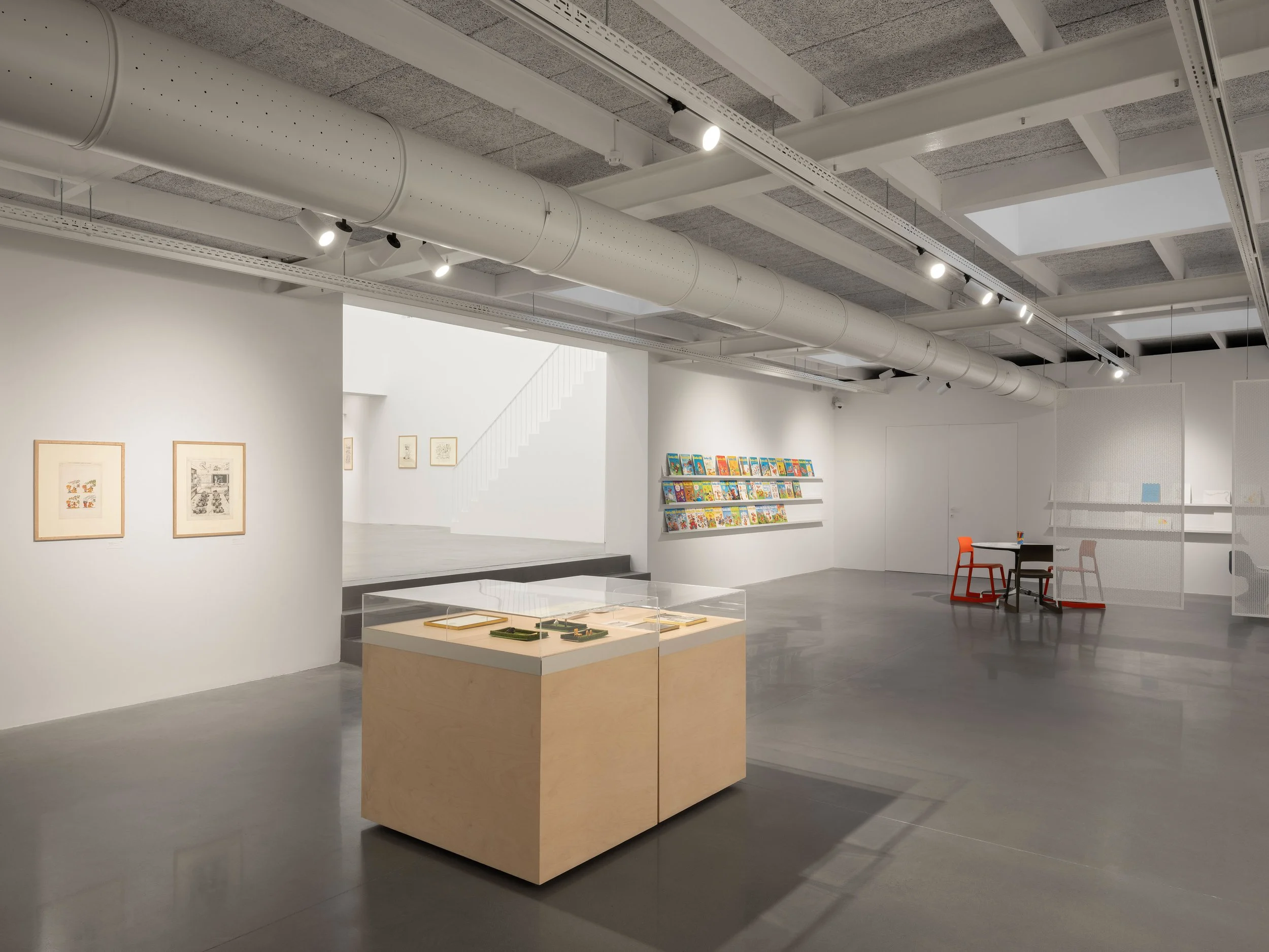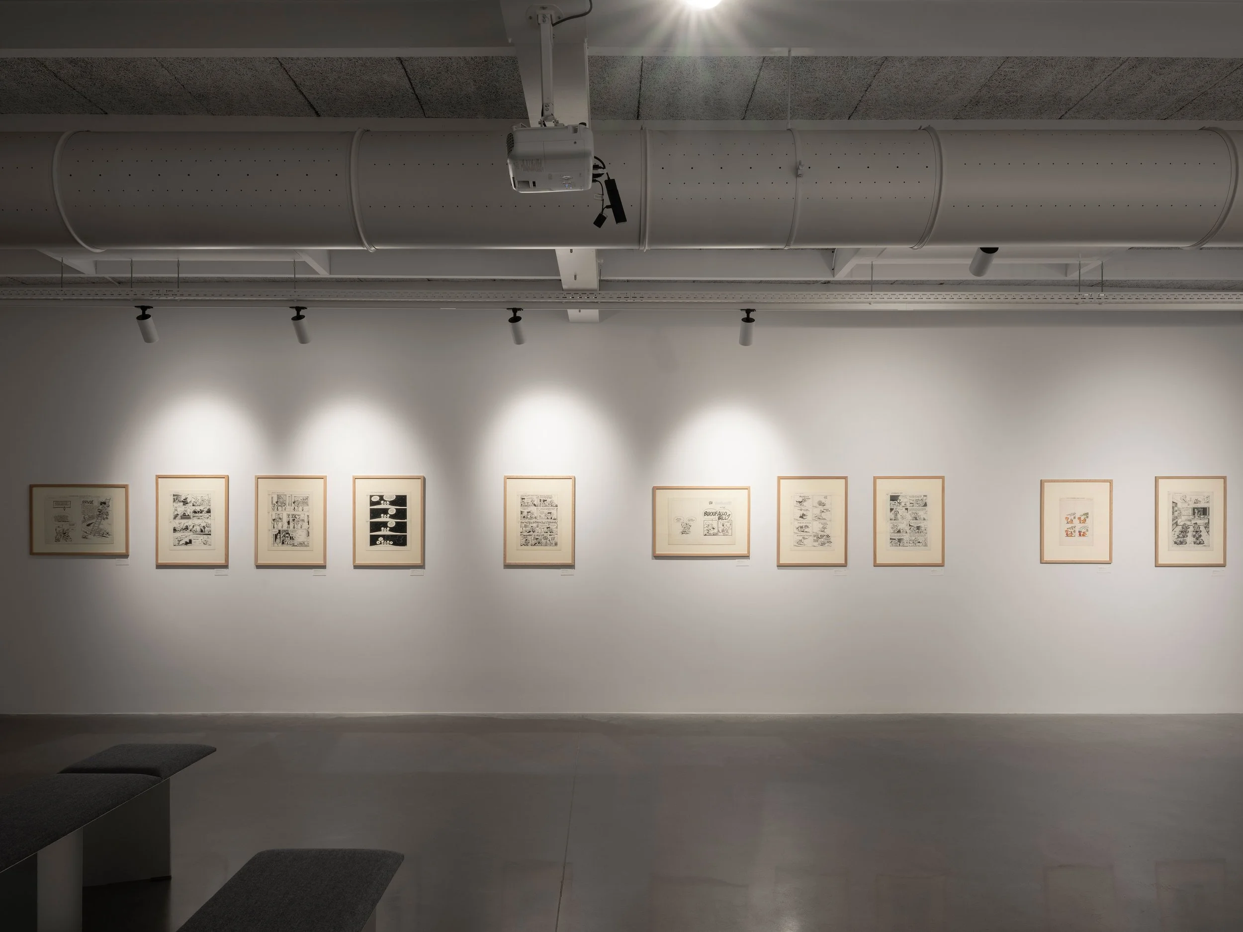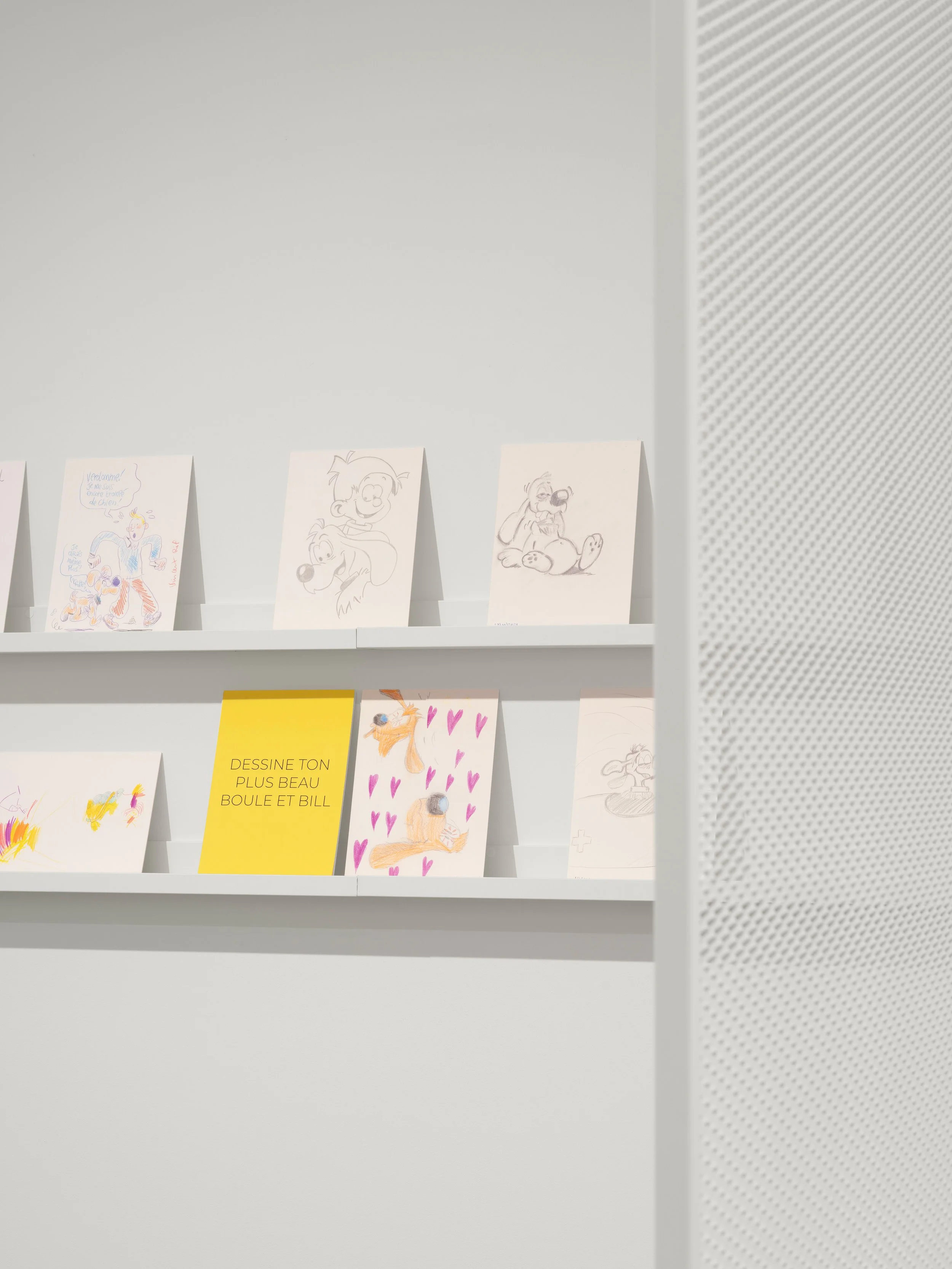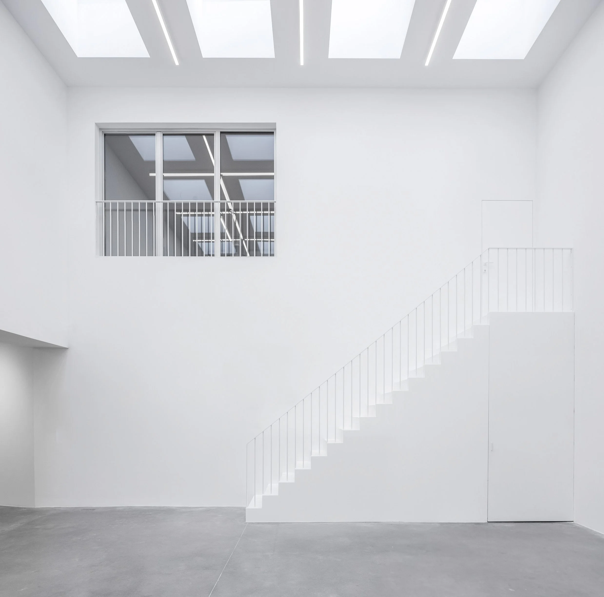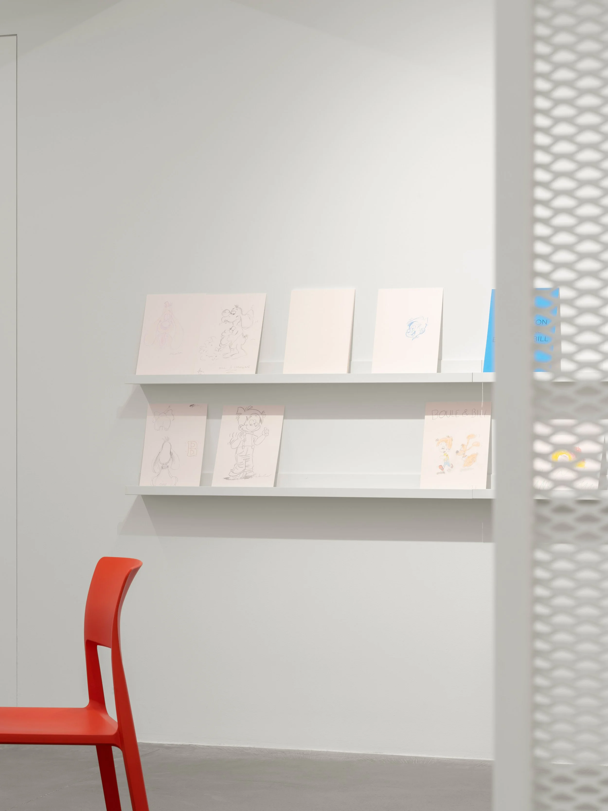 The plan offers a route to the visitor made of successive narrowing and broadening, of height differences. It becomes a sort of interior street with facades. The post-modern front window is kept for its singularity, integrating a bigger glass curtain centred on the project’s main perspective leading the visitor from the street to the end of the inside block. This refurbishment gives to Huberty & Breyne the biggest European comics art gallery position. All new and existing partitions have been isolated to answer the latest ecological Belgian rules. It was a priority to drive this project as an exemplary refurbishment in terms of sustainability. All materials and details have been thought as pure as possible in order to fade in comparison to the artwork, to enhance it.